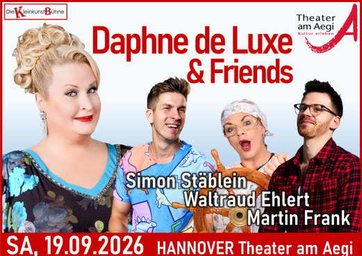 Mit DAPHNE DE LUXE & FRIENDS wagt die blonde Powerfrau zum wiederholten Male den Schritt auf die große Bühne des Theater am Aegi und präsentiert ihrem Hannoveraner Publikum einen abwechslungsreichen Abend voller Gags, Lieder und Anekdoten, jeder Menge Humor und Selbstironie und gnadenlos guter Unterhaltung.
